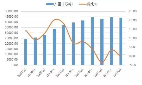 根據(jù)國家統(tǒng)計(jì)局?jǐn)?shù)據(jù),2017年一季度全國水泥總產(chǎn)量達(dá)44115萬噸,同比下滑0.3%,這次與2015年是近十年以來唯一的兩次負(fù)增長(zhǎng),盡管跌幅微弱,但同樣值得重視。