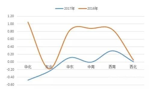 圖2:2016、2017年六大區(qū)域?qū)θ珖喈a(chǎn)量增速貢獻(xiàn)的百分點(diǎn)