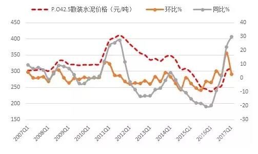 一季度,全國P.O42.5散裝水泥平均價(jià)格為309.5元/噸,環(huán)比上漲2.88%,已連續(xù)四個(gè)季度呈上漲走勢(shì),上漲連續(xù)性近十年罕見,且同比漲幅高達(dá)30%,創(chuàng)近十年新高,高于2011年一季度23.6%的水平。