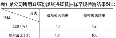 優(yōu)質的粉煤灰摻入混凝土可明顯地改善混凝土的和易性,當粉煤灰摻量大于膠材總量的5%~10%時,效果極為明顯?,F今在混凝土實際生產中,粉煤灰摻量往往達到20%,有的甚至高達30%,但混凝土的和易性卻不盡人意。抽取原材料進行檢測時,發(fā)現粉煤灰的檢測結果經常不滿足標準要求或者與驗收時的結果相差甚遠?,F以某公司所用Ⅱ級粉煤灰進場及抽樣常規(guī)檢測結果進行對比,見表1。
