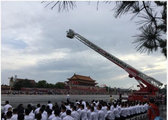 此外,為滿足各種拍攝條件,央視還精選了中聯(lián)重科56米泵車和32米云梯消防車。56米泵車可謂是大號(hào)“攝像搖臂”,在其臂架前端架設(shè)攝像機(jī)輔助拍攝閱兵隊(duì)伍行進(jìn)的動(dòng)態(tài)長鏡頭。32米云梯消防車則是超高的“拍攝平臺(tái)”,央視的“長頸鹿攝像機(jī)”架設(shè)在高度32米的消防平臺(tái)上,攝像師站在平臺(tái)上捕捉受閱裝備彎道轉(zhuǎn)彎的精彩畫面,體現(xiàn)鋼鐵洪流卷起滾滾烽煙。在前期,云梯消防車還承擔(dān)了輔助架設(shè)“天鷹”的重任。