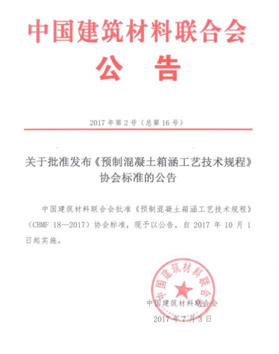 摘要:2017年7月,由中國(guó)混凝土與水泥制品協(xié)會(huì)(以下簡(jiǎn)稱協(xié)會(huì))組織制定的《預(yù)制混凝土箱涵工藝技術(shù)規(guī)程》和《混凝土用氧化鎂膨脹劑》兩項(xiàng)協(xié)會(huì)標(biāo)準(zhǔn),通過(guò)審定并發(fā)布批準(zhǔn)公告,標(biāo)準(zhǔn)號(hào)分別為CBMF 18-2017和CBMF 19-2017,將同時(shí)于2017年10月1日起實(shí)施。