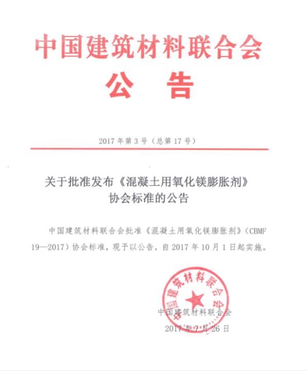 2017年7月,由中國(guó)混凝土與水泥制品協(xié)會(huì)(以下簡(jiǎn)稱協(xié)會(huì))組織制定的《預(yù)制混凝土箱涵工藝技術(shù)規(guī)程》和《混凝土用氧化鎂膨脹劑》兩項(xiàng)協(xié)會(huì)標(biāo)準(zhǔn),通過(guò)審定并發(fā)布批準(zhǔn)公告,標(biāo)準(zhǔn)號(hào)分別為CBMF 18-2017和CBMF 19-2017,將同時(shí)于2017年10月1日起實(shí)施。這是國(guó)務(wù)院《深化標(biāo)準(zhǔn)化工作改革方案》(國(guó)發(fā)[2015]13號(hào))及質(zhì)檢總局、國(guó)家標(biāo)準(zhǔn)委《關(guān)于培育和發(fā)展團(tuán)體標(biāo)準(zhǔn)的指導(dǎo)意見》(國(guó)質(zhì)檢標(biāo)聯(lián)[2016]109號(hào))發(fā)布后,協(xié)會(huì)與中國(guó)建筑材料聯(lián)合會(huì)(以下簡(jiǎn)稱聯(lián)合會(huì))聯(lián)合發(fā)布的首批協(xié)會(huì)標(biāo)準(zhǔn),兩項(xiàng)標(biāo)準(zhǔn)將公開出版并發(fā)行。
