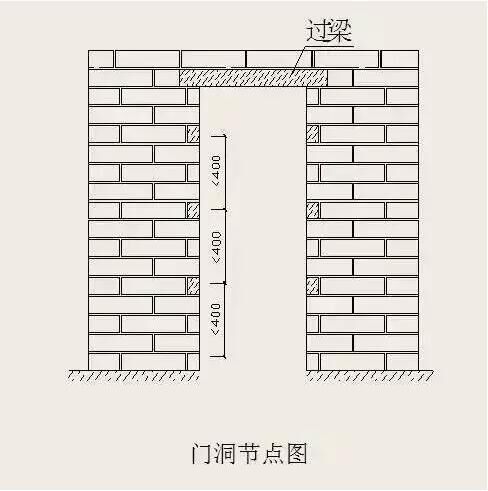 當(dāng)內(nèi)墻為砌體時,應(yīng)沿門洞口兩側(cè),采取灰砂磚或水泥磚或C20混凝土預(yù)制塊,以每隔500~600mm間距替換加氣磚;門洞兩側(cè)自離地500起,采取灰砂磚或水泥磚或C20混凝土預(yù)制塊。
