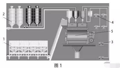 圖1為某商品混凝土攪拌站生產(chǎn)程序主界面的背景圖。1.配料機,骨料秤;2.水泥煤灰等粉料倉,通過螺旋機輸送到水泥秤和煤灰秤的秤斗里,疊加秤;3.水泵;4.添加劑泵;5.攪拌機。