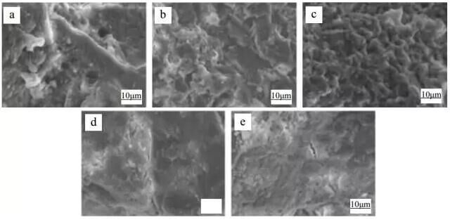 圖 1 不同膨脹劑摻量的預(yù)拌補(bǔ)償收縮混凝土微觀形貌(1000×) (a)HCSA:0%; (b)HCSA:4%; (c)HCSA:6%; (d)HCSA:8%; (e)HCSA:10%