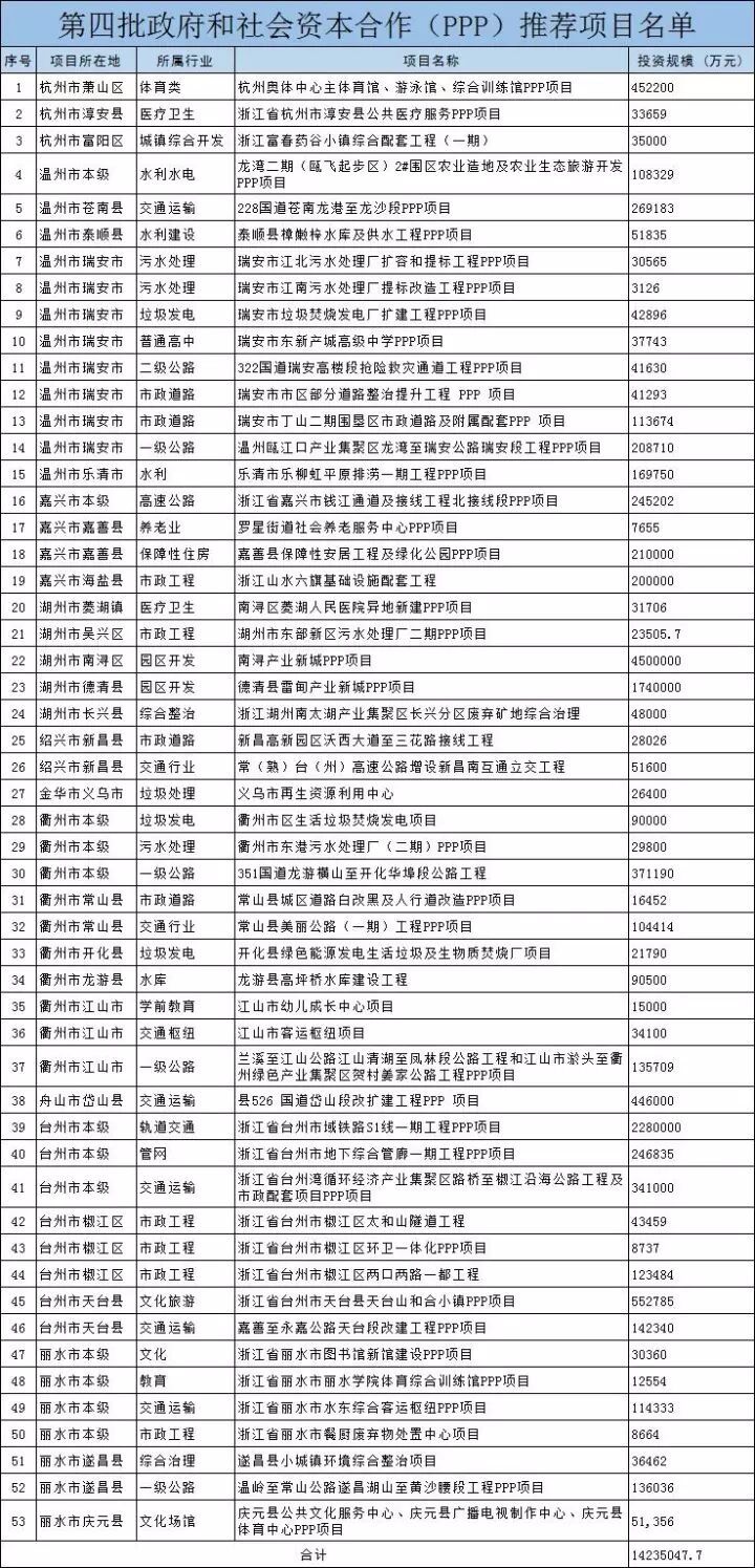 浙江省財(cái)政廳推薦53個(gè)PPP項(xiàng)目,總投資金額1424億元。