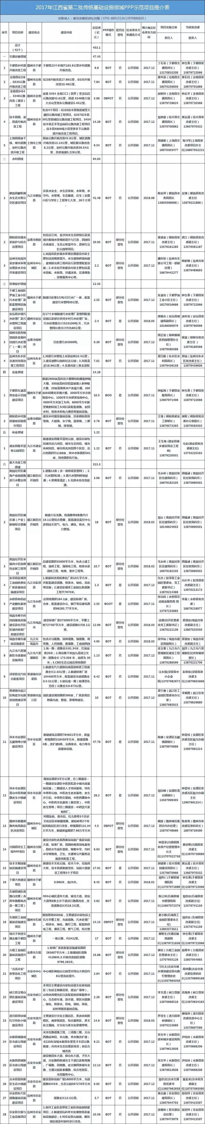 江西發(fā)改委推介2017年43個(gè)PPP項(xiàng)目,總投資453.14億元。