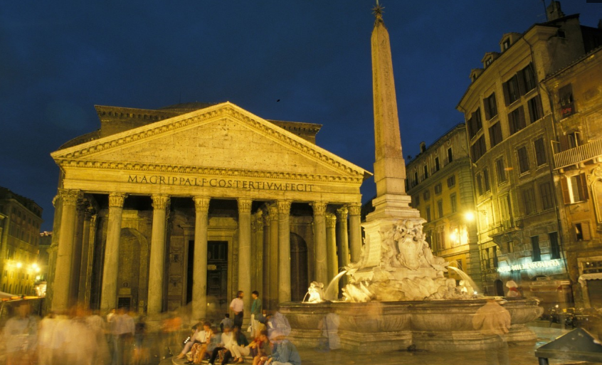 在羅馬市中心,有一個(gè)中央豎立著高大的尖頂方碑的噴水池,方碑基座雕有古羅馬神話場(chǎng)景,這一噴水池所在地就是羅馬萬(wàn)神殿的前庭。它是至今完整保存的唯一一座羅馬帝國(guó)時(shí)期建筑