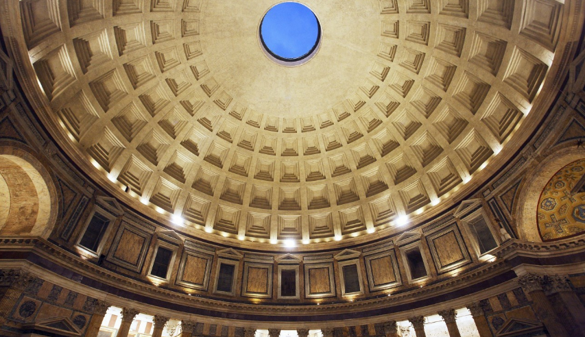穹頂頂部的矢高和直徑一樣,也是43.3米,這樣,萬(wàn)神殿的剖面恰好可以容得下一個(gè)整圓,而它的內(nèi)部墻面兩層分割也接近于黃金分割,因此它常被作為通過(guò)幾何形式達(dá)到構(gòu)圖和諧的古代實(shí)例。