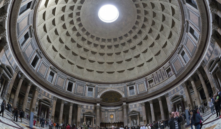 萬(wàn)神殿下半部為空心圓柱形,從高度一半的地方開(kāi)始,上半部為半球形的穹頂。 萬(wàn)神殿的基礎(chǔ)部分底部寬7.3米,墻和穹頂?shù)撞亢襁_(dá)6米,穹頂頂部厚1.5米。為了減輕穹頂?shù)闹亓?,建筑師巧妙地在穹頂?nèi)表面作了28個(gè)凹格,分成5排,同時(shí),在墻上有門(mén)的的前提下還開(kāi)了7個(gè)凹室作為祭龕,這些祭龕里原來(lái)放的可能是神像,一些名人的墓穴。