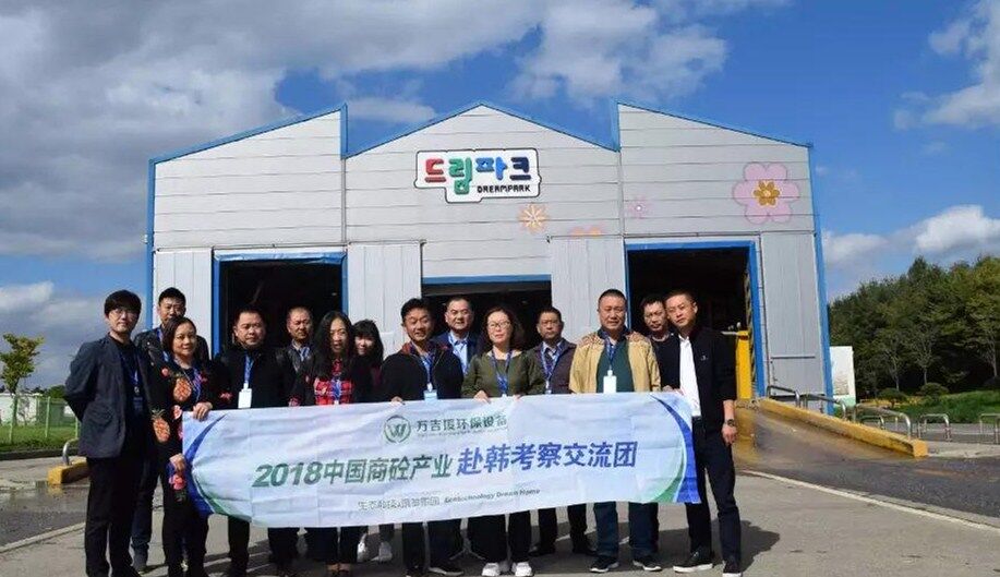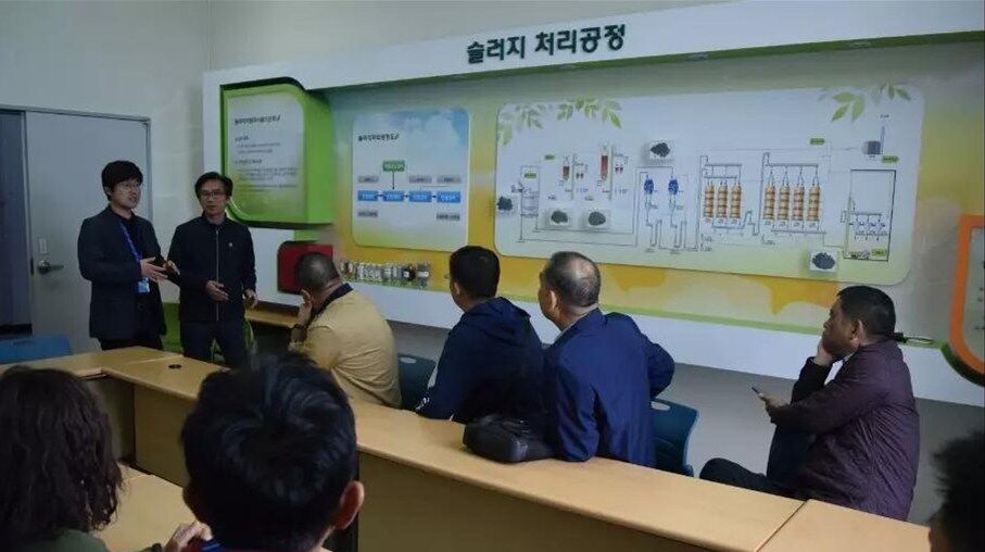 10日下午考察團(tuán)一行到達(dá)韓國最大的垃圾填埋廠,首先參觀生活食品垃圾運(yùn)輸車輛沖洗設(shè)備,此套設(shè)備由兩組車輛沖洗線構(gòu)成,每條線長度為50米,當(dāng)車輛駛?cè)胫粮袘?yīng)區(qū)設(shè)備自動啟動對車輛全方位立體式?jīng)_洗,沖洗中掉落的異物經(jīng)特制排泥裝置送至中央皮帶輸送機(jī)。車輛完成沖洗后駛出前對車身噴淋消毒去異味藥劑,最后烘干后離開。每日完成一千車次的清洗消毒工作。