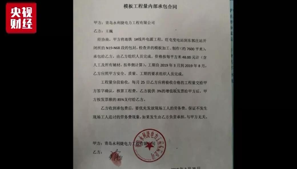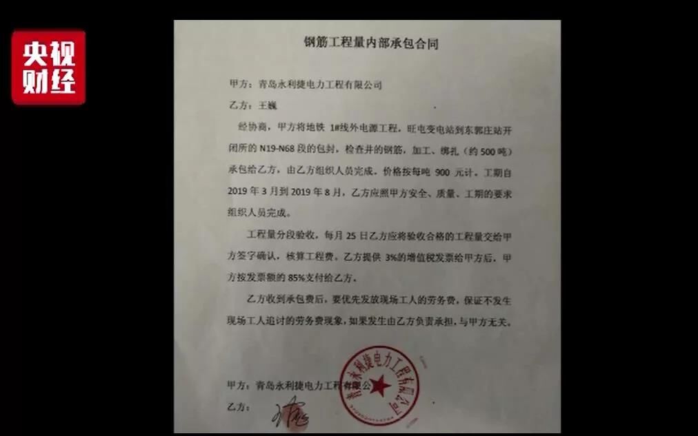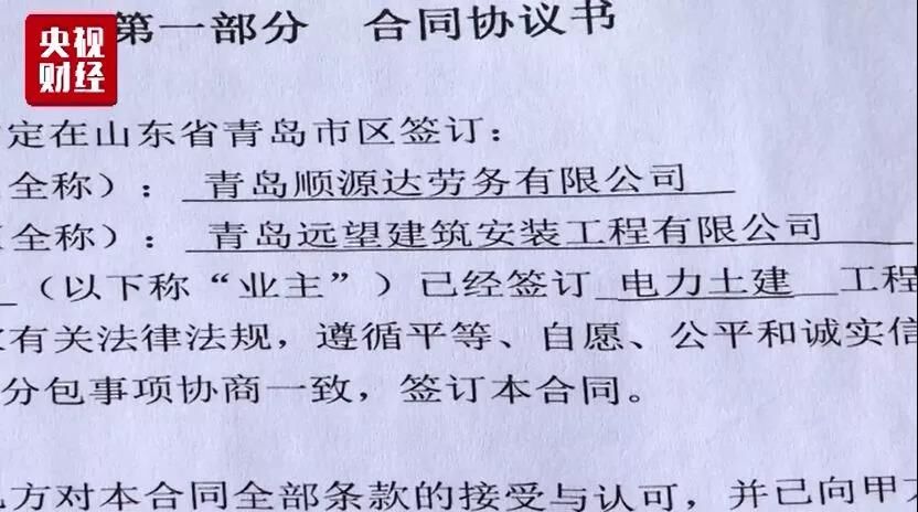 劉飛云介紹,該標(biāo)段總承包方為中國葛洲壩集團電力有限責(zé)任公司,總承包方通過青島永利捷電力工程有限公司、青島順源達勞務(wù)有限公司等層層分包,最終由他所在的青島遠望建筑安裝工程有限公司實際施工。