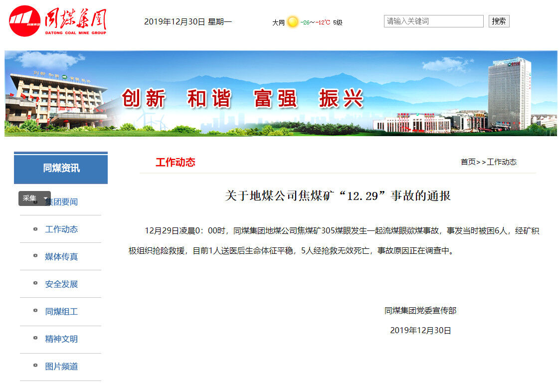 聲威水泥事故受困人員與死神擦肩而過,可謂有驚無險(xiǎn)。可是同煤集團(tuán)受困人員就沒有那么幸運(yùn)了,12月29日凌晨0時(shí),同煤集團(tuán)地煤公司焦煤礦305煤眼發(fā)生一起流煤眼歘煤事故,事發(fā)當(dāng)時(shí)6人被困,經(jīng)積極組織搶險(xiǎn)救援,目前1人送醫(yī)后生命體征平穩(wěn),5人經(jīng)搶救無效死亡,事故原因正在調(diào)查中。
