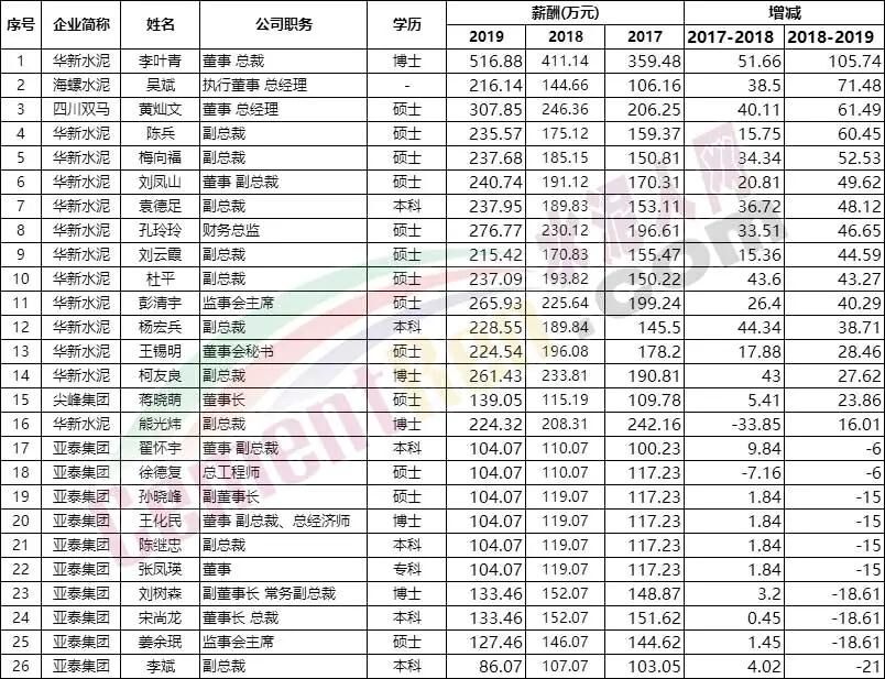 各大水泥集團高管的工資排行榜
