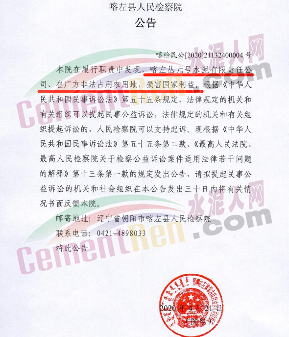 據(jù)了解,4月21日,遼寧省朝陽市喀左縣人民檢察院在履行職責(zé)中發(fā)現(xiàn),喀左叢元號水泥有限責(zé)任公司、崔廣方非法占用農(nóng)用地,損害國家利益。根據(jù)《中華人民共和國民事訴訟法》第五十五條規(guī)定,法律規(guī)定的機關(guān)和有關(guān)組織可以提起民事公益訴訟,法律規(guī)定的機關(guān)和有關(guān)組織提起訴訟的,人民檢察院可以支持起訴。