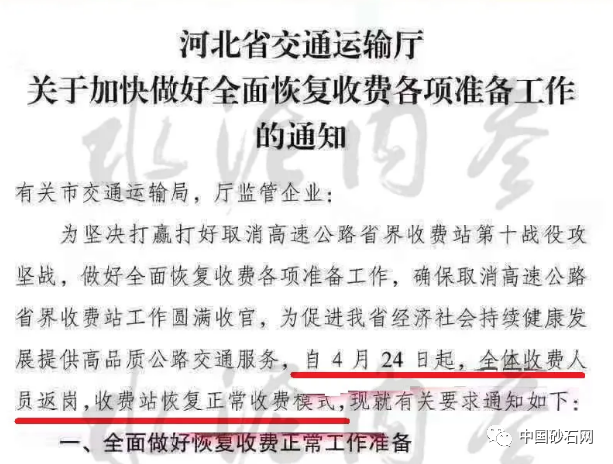 據(jù)中國砂石協(xié)會和中國砂石網(wǎng)了解,日前,河北省交通運(yùn)輸廳發(fā)布《關(guān)于加快做好全面恢復(fù)收費各項準(zhǔn)備工作的通知》稱為堅決打贏打好取消高速公路省界收費站第十戰(zhàn)役攻堅戰(zhàn),做好全面恢復(fù)收費各項準(zhǔn)備工作,確保取消高速公路省界收費站工作圓滿收官,為促進(jìn)全省經(jīng)濟(jì)社會持續(xù)健康發(fā)展提供高品質(zhì)公路交通服務(wù),自4月24日起,全體收費人員返崗,收費站恢復(fù)正常收費模式。