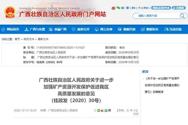 近日,廣西壯族自治區(qū)人民政府發(fā)布《關(guān)于進(jìn)一步加強(qiáng)礦產(chǎn)資源開(kāi)發(fā)保護(hù)促進(jìn)我區(qū)高質(zhì)量發(fā)展的意見(jiàn)》,針對(duì)自治區(qū)礦業(yè)開(kāi)發(fā)布局不合理、規(guī)模化水平不高、粗放利用和生態(tài)環(huán)境保護(hù)不到位等問(wèn)題提出若干建議,努力加強(qiáng)礦產(chǎn)資源開(kāi)發(fā)保護(hù),提高礦產(chǎn)資源有序開(kāi)發(fā)和綜合利用水平。