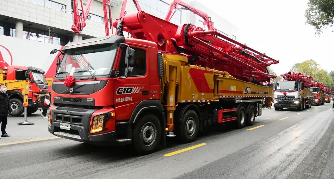長沙廠區(qū)主干道上,66臺“世界泵王”整裝待發(fā),接受現(xiàn)場各位領導和來賓的檢閱。本次發(fā)貨的產品涵蓋37米、43米、56米等多款明星產品,更有S系列泵車的大力加持,大部分為國六新品。