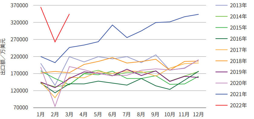 根據(jù)海關(guān)數(shù)據(jù)整理,2021年1-3月我國工程機(jī)械進(jìn)出口貿(mào)易額為105.08億美元,同比增長(zhǎng)36%。其中進(jìn)口金額7.85億美元,同比下降22.8%;出口金額97.23億美元,同比增長(zhǎng)45%,貿(mào)易順差89.38億美元,同比增加32.49億美元。2022年1-3月各月進(jìn)出口情況如表1所示,2013年-2022年月度出口金額如圖1所示。