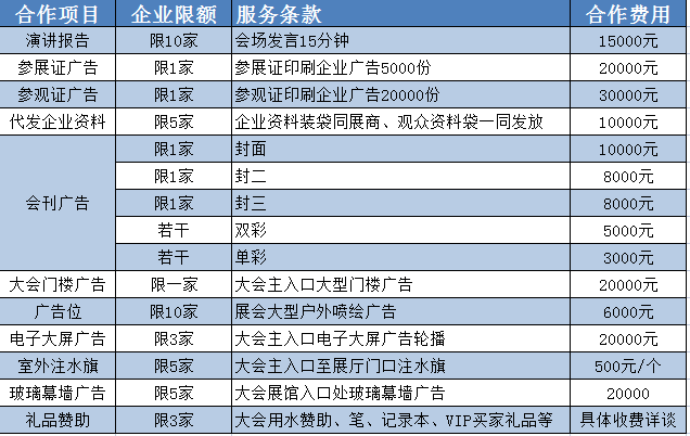 八、合作方式:我們誠摯邀請(qǐng)并期待您的參與,合作方式包括但不僅限于:企業(yè)演講、參展證廣告、參觀證廣告、會(huì)刊廣告、戶外廣告位、注水旗、電子大屏、玻璃幕墻廣告、大會(huì)門樓廣告、禮品贊助、晚宴贊助等