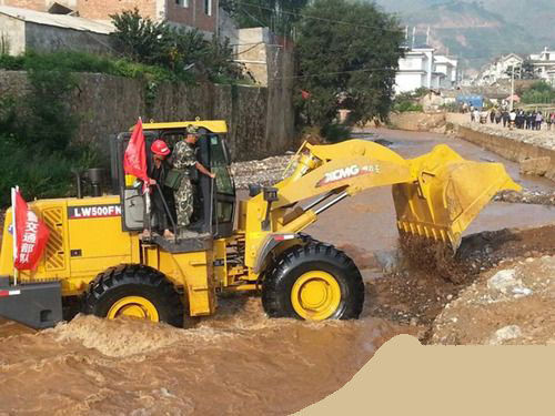 徐工救援隊員早已為車輛做好了一切前期準備,按照指揮部安排,此臺徐工LW500FN裝載機參與清理災區(qū)因塌方被堵塞的河道,并在河道中進行鋪設快速通道工作,從河道中央開出一條水上救援之路。至上午11點,徐工裝載機高效出色地順利完成了任務,不僅排除了水災隱患,更在河道中修出一條“生命線”,使后續(xù)救護車、武警車等救援車輛可以通過這條簡易通道直抵震中,為被困被埋群眾在72小時黃金救援時間內獲救爭取到了更多時間。
