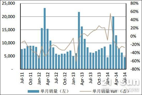 瑞銀表示,行業(yè)整體景氣度并未好轉,下滑之勢未改。2013年4月開始,土方機械單月銷量增速由負轉正,其中挖機銷量在2013年四季度實現了超過20%的增長,裝載機在8月后亦實現了超過15%的月均銷量增長。但進入2014年以來,由于房地產銷售及新開工不佳,2014年3月,挖掘機和裝載機銷量分別下滑8%和4%,結束了11個月的正增長。此后4-7月,跌幅持續(xù)擴大,其中7月挖機銷量下降27%,裝載機銷量下滑20%。