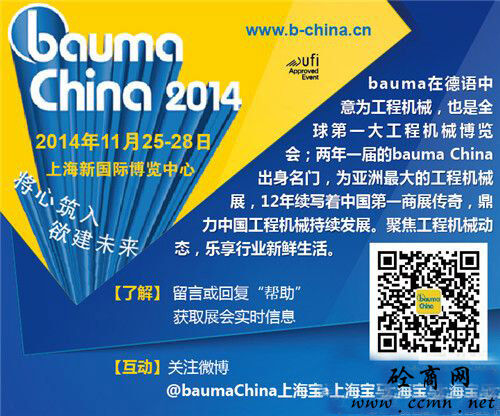 China 2014,11月25-28日行業(yè)翹楚絢麗登陸上海新國(guó)際博覽中心,工程機(jī)械行業(yè)產(chǎn)品全面細(xì)分展示。看風(fēng)云變幻,捕行業(yè)動(dòng)向,我們相約bauma China 2014!