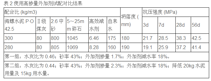 試配對比結(jié)果分析:其他材料相同,使用高效減水劑(NF-1),保持砂率及外加劑摻量不變,適當(dāng)降低水泥用量及用水量,使水灰比降低,在相同的坍落度下28d 及 56d 強度相近并降低了成本。