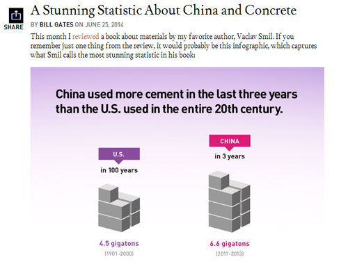 比爾·蓋茨在個(gè)人博客上比較中美水泥消耗