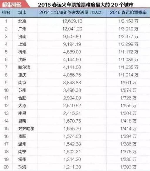 為了更直觀地反映春運(yùn)火車票的購票難度,我們用全年旅客發(fā)送量轉(zhuǎn)換成“搶票概率”,比如說,北京全年旅客發(fā)送量是1.2億人次,那你每次買票的成功概率就是1.2億分之一。那么,春運(yùn)旅客發(fā)送量如何計算?春運(yùn)一般為期40天,而且集中度很高,根據(jù)我們的評估,期間的量相當(dāng)于平時的3倍,比如,北京春運(yùn)火車旅客發(fā)送量是“12609.10萬人次÷12個月x3倍=3152萬人次”。這個數(shù)據(jù),與鐵路部門公布的2015北京春運(yùn)火車旅客發(fā)送量(2796.2萬人次)非常接近,我們認(rèn)為還是非??孔V的。這樣,北京地區(qū)春運(yùn)火車票搶票概率就是1/3152萬。概率越低,搶票的難度越大。