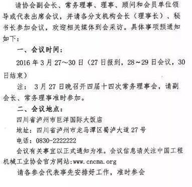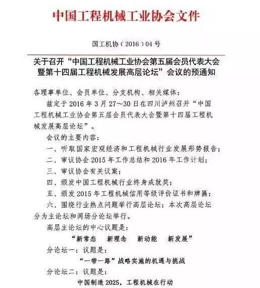 中國工程機(jī)械工業(yè)協(xié)會第五屆會員代表大會暨第十四屆工程機(jī)械發(fā)展高層論壇茲定于2016年3月27日~30日在四川瀘州召開。