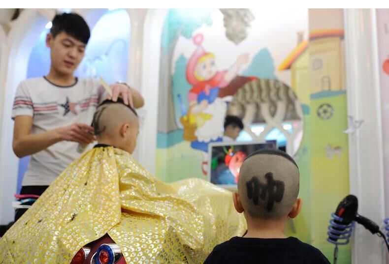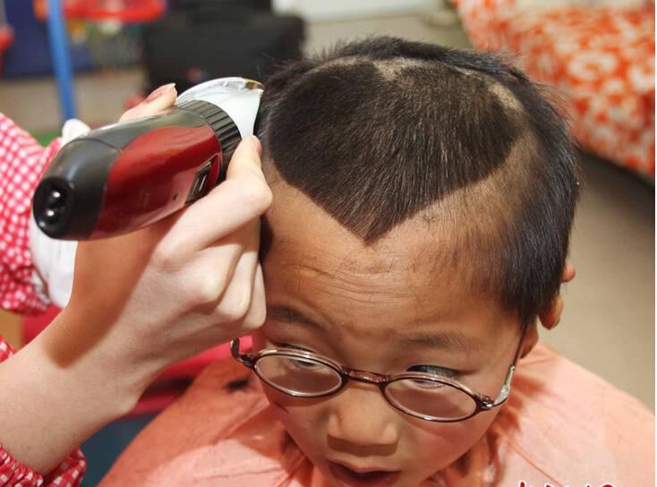 一個孩子正在“剃喜頭”。
