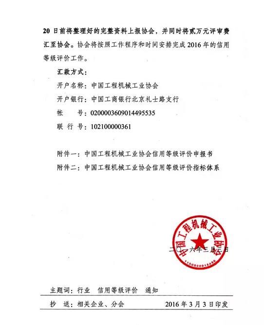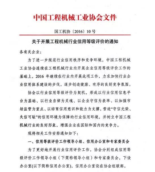 為了進(jìn)一步規(guī)范行業(yè)信用秩序和競爭環(huán)境,中國工程機(jī)械工業(yè)協(xié)會連續(xù)在工程機(jī)械行業(yè)內(nèi)開展企業(yè)信用等級評價工作的基礎(chǔ)上,2016年繼續(xù)在行業(yè)內(nèi)開展此項(xiàng)工作,力求加快行業(yè)企業(yè)信用體系建設(shè)的步伐,逐步創(chuàng)造健康、有序的良好競爭氛圍。