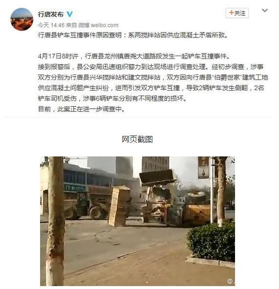 17日8時許,行唐縣發(fā)生鏟車互撞事件。經(jīng)警方初步調(diào)查,涉事雙方為行唐縣兩攪拌站,因向某建筑工地供應(yīng)混凝土問題產(chǎn)生糾紛,進而沖突。致2輛鏟車發(fā)生側(cè)翻,2名鏟車司機受傷,涉事6輛鏟車分別有不同程度的損壞。該案還在進一步調(diào)查中。