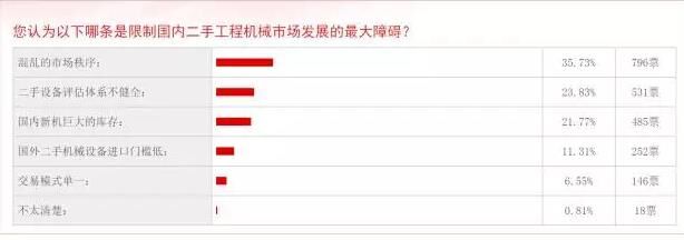 工程機(jī)械區(qū)別于其他行業(yè)一個重要的地方是,二手商品的回收利用尤為重要,因?yàn)橐粋€機(jī)械的生命周期相對于快消品來說更長,所以在二手商品的回收、租賃同樣存在巨大機(jī)會。但是該行業(yè)目前發(fā)展前景不明朗。在慧聰工程機(jī)械網(wǎng)的一項(xiàng)“限制二手工程機(jī)械市場發(fā)展的最大障礙”的投票中,“混亂的市場秩序”得票最高,796票,“二手設(shè)備評估體系不健全”排名第二,得票531,“國內(nèi)新機(jī)的巨大庫存”排名第三,得票485。