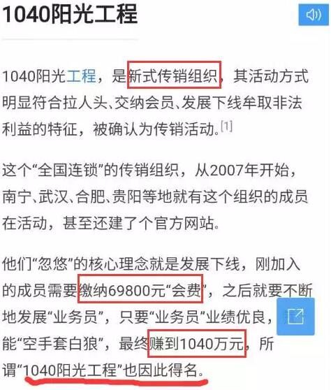 網(wǎng)友爆料稱:"1040陽光工程"打著“國家項(xiàng)目工程“、”資本運(yùn)行“的旗號(hào)在普洱大量蔓延,已有很多人上當(dāng)受騙,自己也為受害者之一,自家共被騙10多萬元,今天想曝光該事件,少些人上當(dāng)受騙。