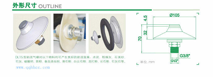 助流氣蝶前部是多孔金屬,外部通入的高壓空氣,經(jīng)過氣嘴后均勻分散在氣嘴周圍,促使粉料流動(dòng),達(dá)到助流效果。流化效果由氣嘴數(shù)量確定,不同的粉料及容器狀況需要不同數(shù)量的氣嘴。本產(chǎn)品具有安裝維護(hù)方便,價(jià)格低廉、流化效果明顯等突出優(yōu)點(diǎn)。 是水泥倉頂除塵器,攪拌站倉頂除塵器,以及水泥罐倉頂除塵器重要元件。