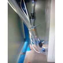 將膩?zhàn)臃郯b袋套在出料嘴上,撥動(dòng)彈簧開關(guān),壓袋氣缸開始工作并壓住袋口,控制器將包裝袋重量自動(dòng)去除,通過空壓機(jī)的氣流經(jīng)三分管分成三路,其中一路去往進(jìn)料口進(jìn)行破拱,保證下料暢通。葉輪高速轉(zhuǎn)動(dòng)迅速將物料撥出灌入袋中,隨袋中空氣一起溢出的粉塵經(jīng)排氣孔排出(對(duì)環(huán)保要求高的用戶也可連接吸塵器,由除塵器吸走)。待加料達(dá)到粗流設(shè)定值(L1)時(shí),氣缸自動(dòng)將橡膠軟管夾至1/2開口,出料速度減慢,到總設(shè)定(L2)時(shí),氣缸將橡膠軟管完全夾死,出料停止,壓袋氣缸松開袋口,灌裝結(jié)束。