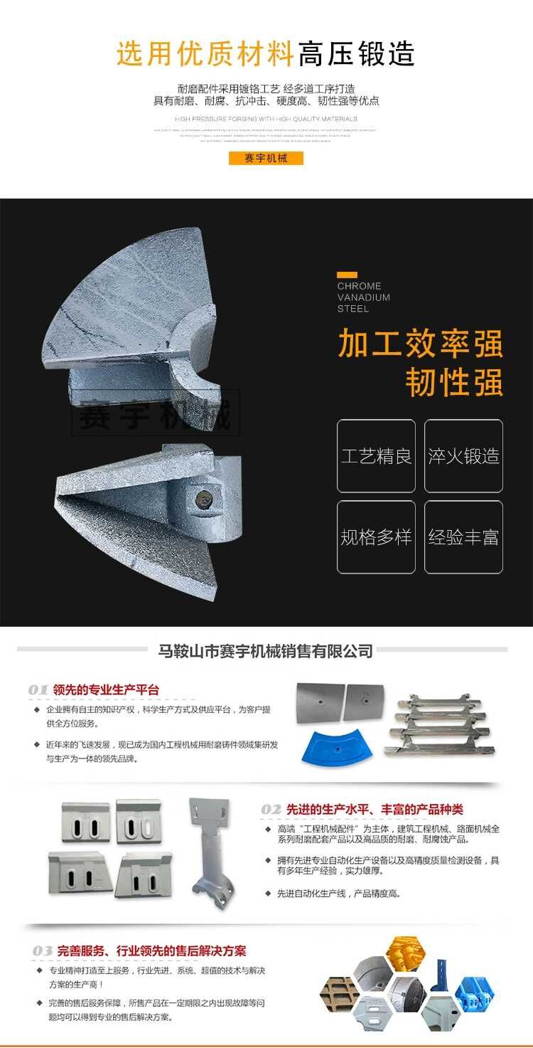 馬鞍山市賽宇機械銷售有限公司主要產(chǎn)品有:混凝土攪拌站攪拌主機配件、瀝青拌合站攪拌機配件、穩(wěn)定土拌合站配件、攤鋪機配件、路拌機配件、銑刨機刀頭、平地機,攪拌臂、襯板、攪拌葉片、刀片、中攪拌臂左右攪拌臂、側(cè)攪拌臂、攪拌葉片、葉片、中刮刀、左攪拌葉片、右側(cè)刮刀、襯板、菱形襯板、方形襯板、梯形襯板、側(cè)襯板、端襯板、異形襯板、口襯板、槽體襯板、軸頭密封配件、瀝青攪拌站槳葉、槳臂襯板、除塵布袋、穩(wěn)定土攤鋪機螺旋葉片、履帶板、熨平板、輸料板、平地機刀片、刀角、路拌、銑刨機合金刀頭、刀庫、高強度螺栓、耐磨配件特高鎳鉻合金、多元素合金和高鉻合金。激光切割機,數(shù)控刨槽機,壓力機,卷板機,折彎機、折彎機模具、剪板機、剪板機刀片、數(shù)控折彎機模具、NCT模具、數(shù)控沖模、、橡膠機械刀片,三菱切腳機刀片、高精度圓刀片、鎢鋼刀片各種機械標準及非標模具,鋼鐵工業(yè)刀片、紙制品工業(yè)刀片、信息產(chǎn)業(yè)刀片、紙工業(yè)刀片,塑料行業(yè)刀片,冶金行業(yè)刀片,藥材粉碎切片刀片,電子行業(yè)刀片,包裝行業(yè)刀片,紡織行業(yè)刀片等。為板材加工,鈑金加工,鋼廠,造紙廠,塑料廠,線路板.銅箔制造廠,印刷廠,包裝廠,紡織織布廠及各個行業(yè)機床使用。主要客戶為:航天航空,汽車輪船,金屬加工,混凝土攪拌站、瀝青攪拌站、路面機械租憑公司、路橋公司、中國水利建設(shè)單位、中鐵公司、中國水利局施工局公司、機械廠、電器廠、電子廠、軋鋼廠、紙制品公司全鋼子午線輪胎公司橡膠輪胎廠。