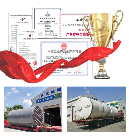 公司先后獲得質(zhì)量技術(shù)監(jiān)督局頒發(fā)的《危險品包裝容器生產(chǎn)許可證》資質(zhì)、工商管理局頒發(fā)的連續(xù)5年《重合同守信用企業(yè)》稱號,公司嚴(yán)格執(zhí)行ISO9001-2015質(zhì)量管理體系,產(chǎn)品通過廣東質(zhì)量檢測中心合格認(rèn)證,公司推出的《久塑》牌儲存罐榮獲中國著名品牌以及中國質(zhì)量技術(shù)監(jiān)督3.15質(zhì)量穩(wěn)定重點(diǎn)推廣品牌。