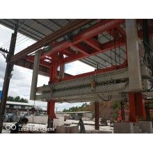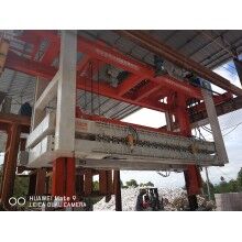 移動式掰板機(jī)工作流程:蒸養(yǎng)完成的成品連同模具側(cè)板被模具側(cè)板運輸裝置送至移動掰板機(jī)下,頂升裝置啟動,將坯體連同側(cè)板頂起,移動掰板機(jī)從上層至下層依次掰開,掰至底層后,移動掰板機(jī)將全部成品夾起,并移至砌塊成品打包線上,將砌塊放置在該打包線上,移動掰板機(jī)繼續(xù)將加氣板移動至加氣板輸送打包線上,重新返回。掰扳機(jī)專門負(fù)責(zé)坯體切開之后(經(jīng)蒸養(yǎng))又重新粘連在一起,在自動打包之前將其一塊一塊分離,消除由于粘連造成的廢、次品,同時保證打包線正常運行。