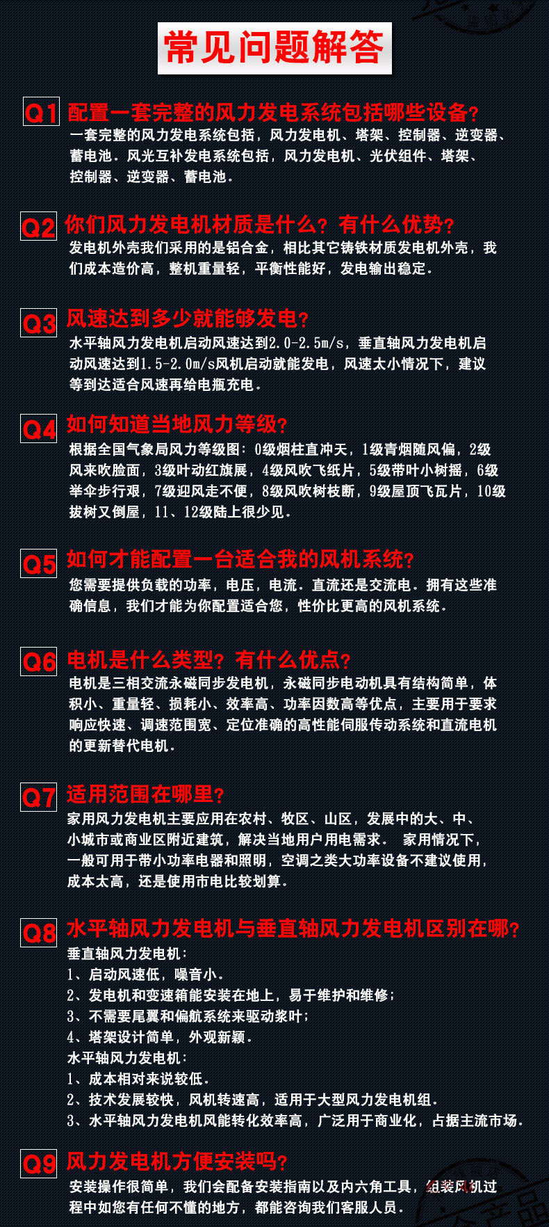 注意:以上寶貝報價為風(fēng)力發(fā)電機(jī)主體的價格(含:5KW發(fā)電機(jī)、回轉(zhuǎn)體、尾舵、風(fēng)輪、風(fēng)葉等組件),如需逆變器、蓄電池、控制器、太陽能板或塔架,請咨詢客服。