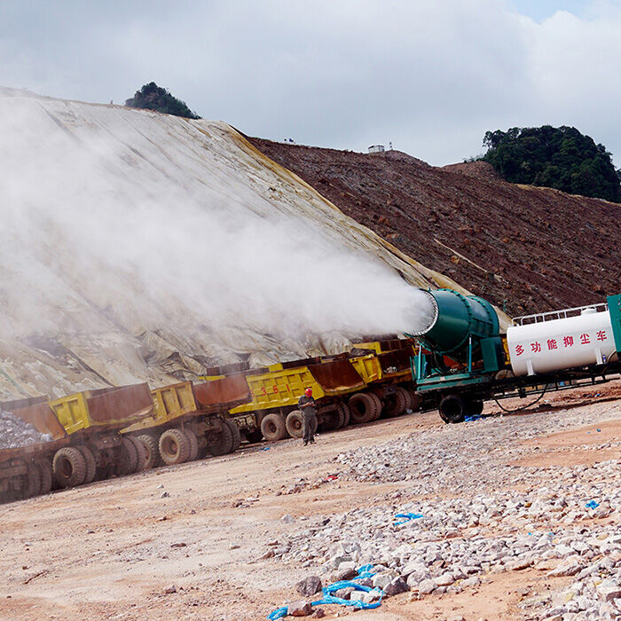 工作原理:霧炮機(jī)采用高壓水泵和特殊噴嘴將水霧化成直徑約10-200μm的細(xì)水霧。 水霧通過(guò)高性能遙控風(fēng)扇送到粉塵濃縮場(chǎng)。 水霧與灰塵結(jié)合,吸收,凝聚,稱(chēng)重,在自身重力作用下沉降到地面,達(dá)到有效降塵的目的,有效除塵率可達(dá)95%,