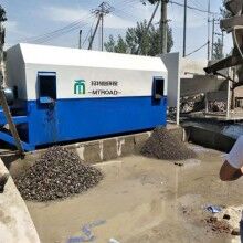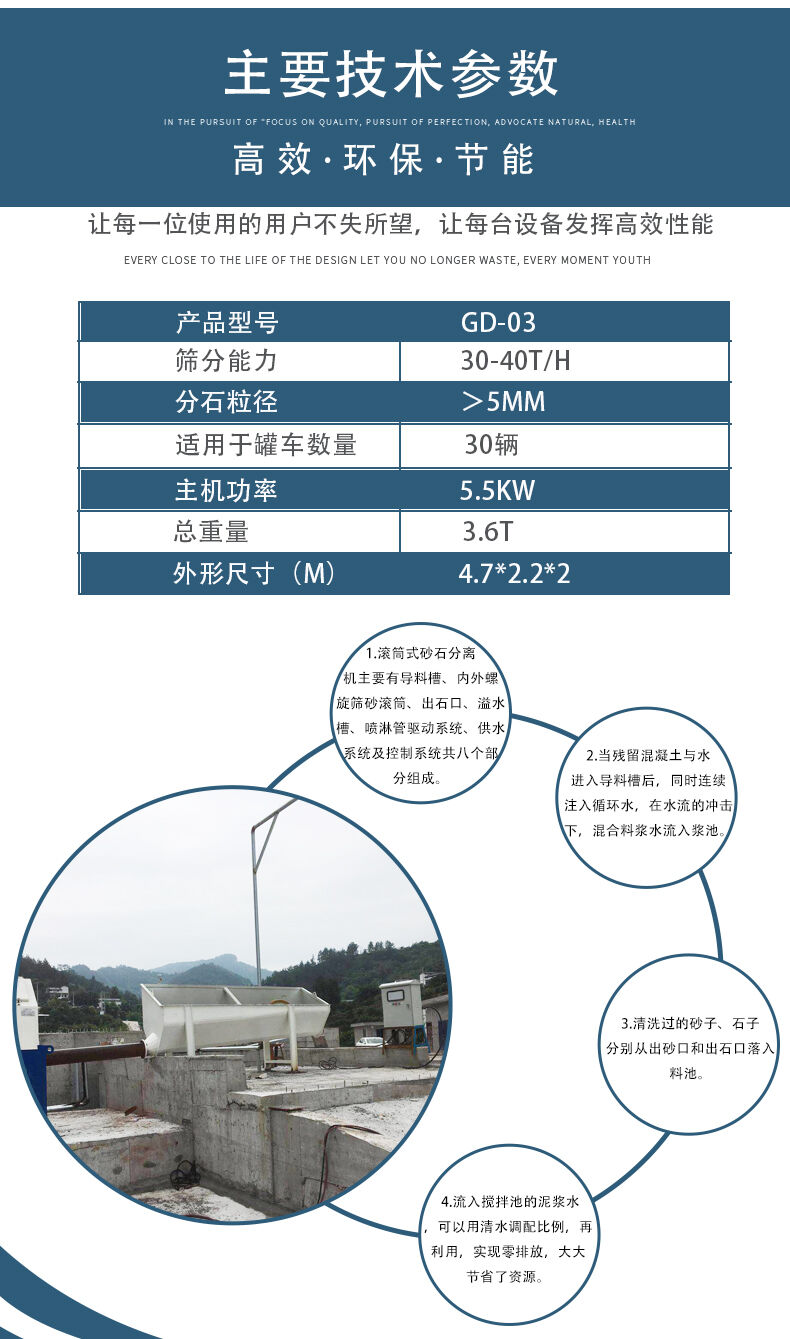 滾筒式砂石分離機主要有導(dǎo)料流槽、內(nèi)外螺旋篩砂滾筒、出石口、溢水槽、噴淋管、驅(qū)動系統(tǒng)、供水系統(tǒng)及控制系統(tǒng)共八個部分組成。當殘留混凝土與水進入導(dǎo)料槽后,同時連續(xù)注入循環(huán)水,在水流的沖擊下,混合料漿水流入漿池。清洗過的砂子、石子分別從出砂口和出石口落入料池。流入攪拌池