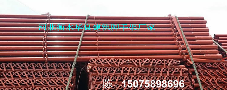 河北衡水華良建筑器材聯(lián)系電話:150-7589-8696 ,輪扣腳手架、碗扣腳手架、快拆式腳手架、承插式新型腳手架、直插式腳手架、鋼管腳手架、建筑腳手架,新型建筑支撐,腳手架,模板支撐,新型模板支撐, 新型建筑支撐。這種新型材料的特點(diǎn)是:耐腐蝕,彈性大,堅(jiān)固不變形。易搭拆腳手架,施工速度快的腳手架。 每根支撐桿可以支撐3-4噸左右,兩根主龍脊之間可以承重2-2.5噸的重量,每根副龍脊可以承重1噸?,F(xiàn)在工地現(xiàn)澆水泥一般厚度也就是10-15厘米,同等面積重量最多100-150公斤,所以這個(gè)支撐力度一般高層建筑完全夠用。