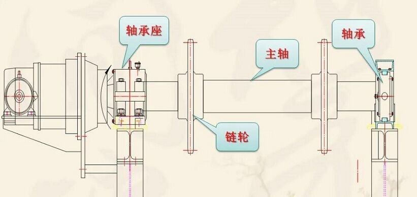 該裝置主要由軸、鏈輪、支承輥等件組成。兩端支撐為滾動軸承,主軸與減速器、空心軸套裝在一起,通過鎖緊盤將其二者連接到一起,達到傳遞扭矩的要求,結(jié)構(gòu)緊湊。