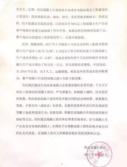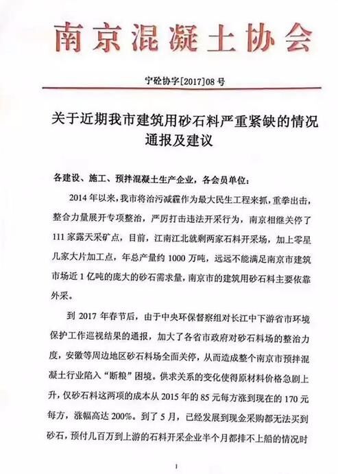 5月26日,南京混凝土協(xié)會(huì)關(guān)于近期南京市建筑用砂石料嚴(yán)重緊缺的情況發(fā)布通報(bào)及建議。公告中提到:目前江南江北僅剩的兩家石料開(kāi)采場(chǎng)遠(yuǎn)遠(yuǎn)不能滿足南京市建筑市場(chǎng)近1億噸的砂石需求量,全市建筑用砂石料主要依靠外采。尤其是在今年春節(jié)以后,中央環(huán)保督察組對(duì)長(zhǎng)江中下游省市環(huán)境保護(hù)巡視結(jié)果的通報(bào),加大了各省市政府對(duì)砂石料場(chǎng)的整治力度,周邊地區(qū)砂石料場(chǎng)全面關(guān)停,從而造成全市預(yù)拌混凝土行業(yè)陷入“斷糧”的困境,這也直接導(dǎo)致原材料價(jià)格急劇上升。