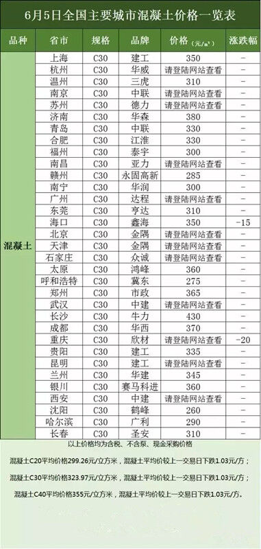 6月5日全國主要城市水泥、混凝土價格表