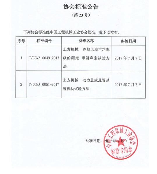 【協(xié)會】中國工程機(jī)械工業(yè)協(xié)會標(biāo)準(zhǔn)公告(第23號)